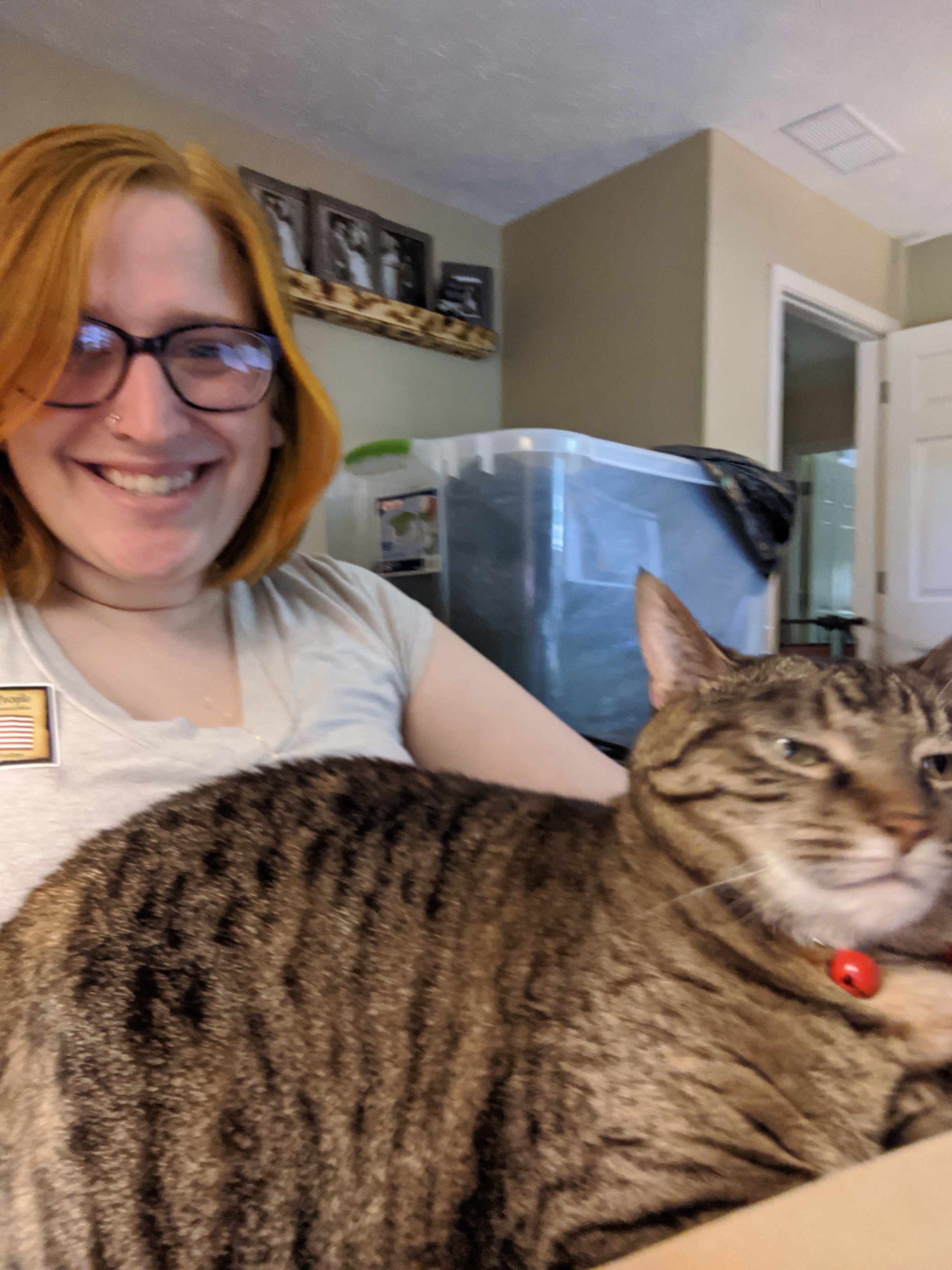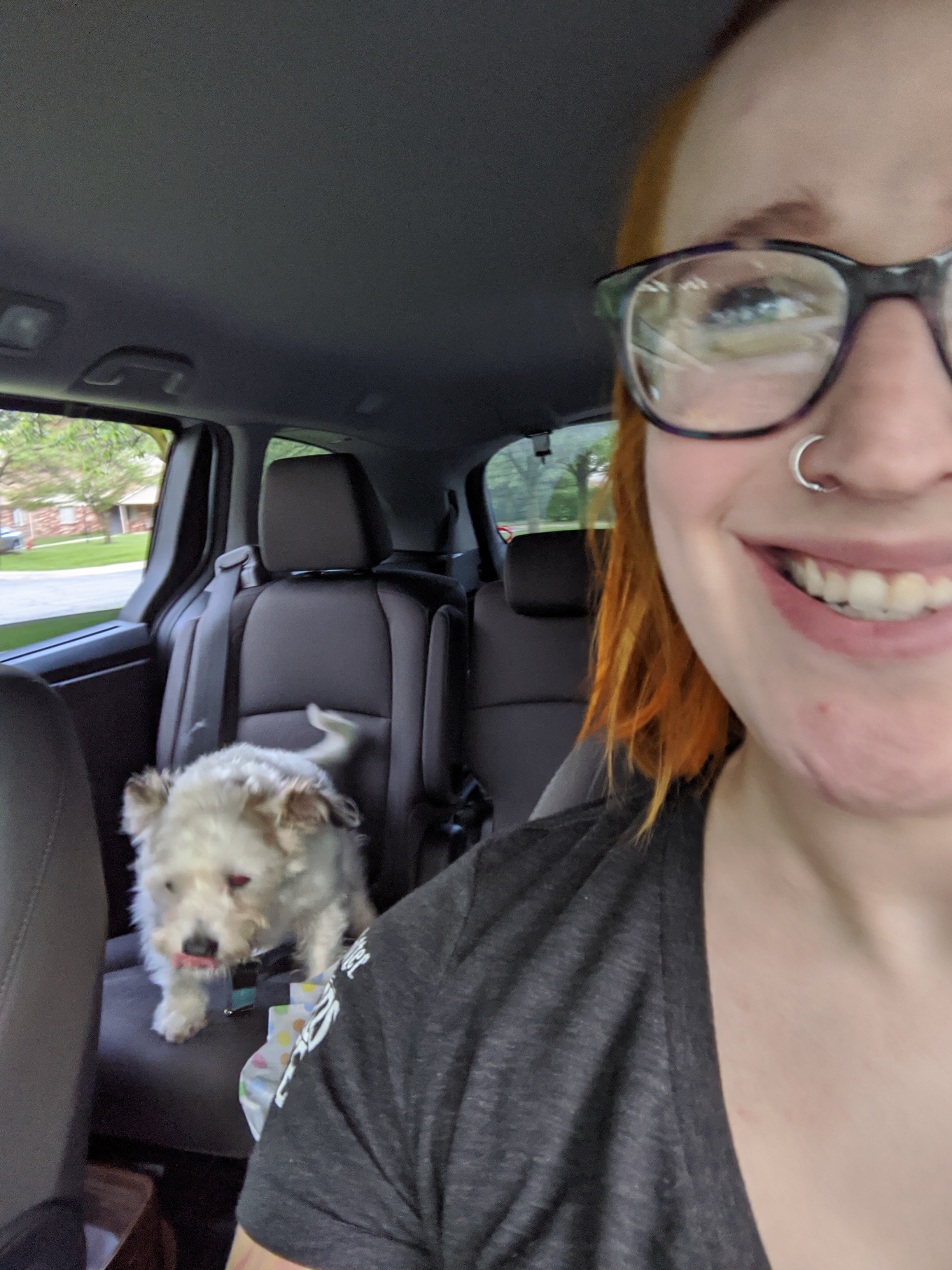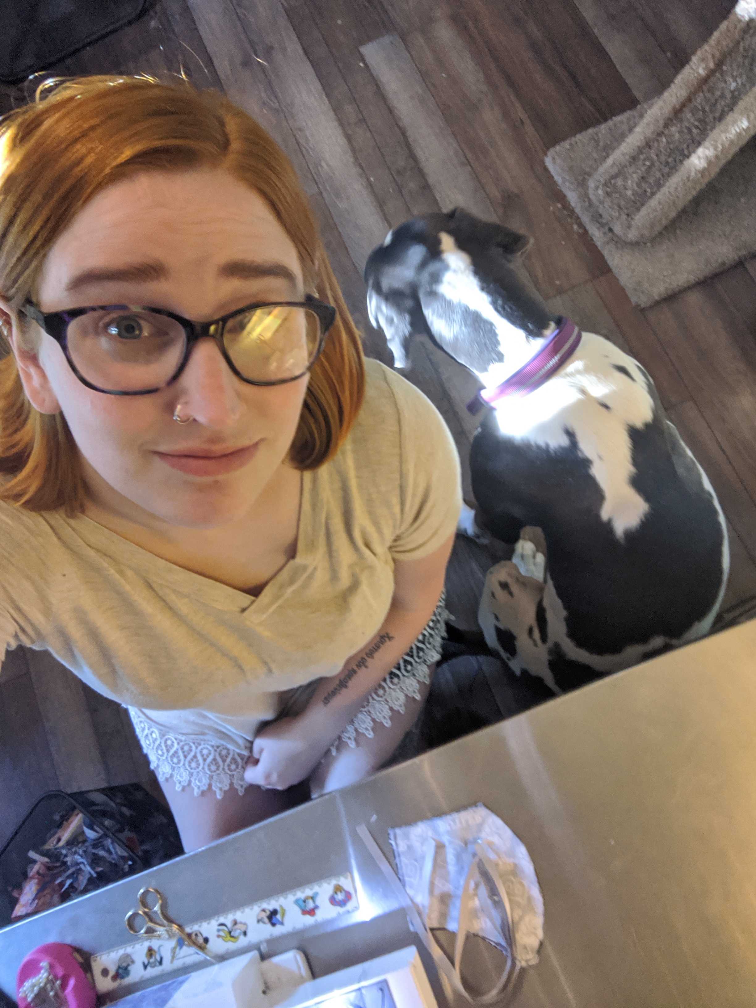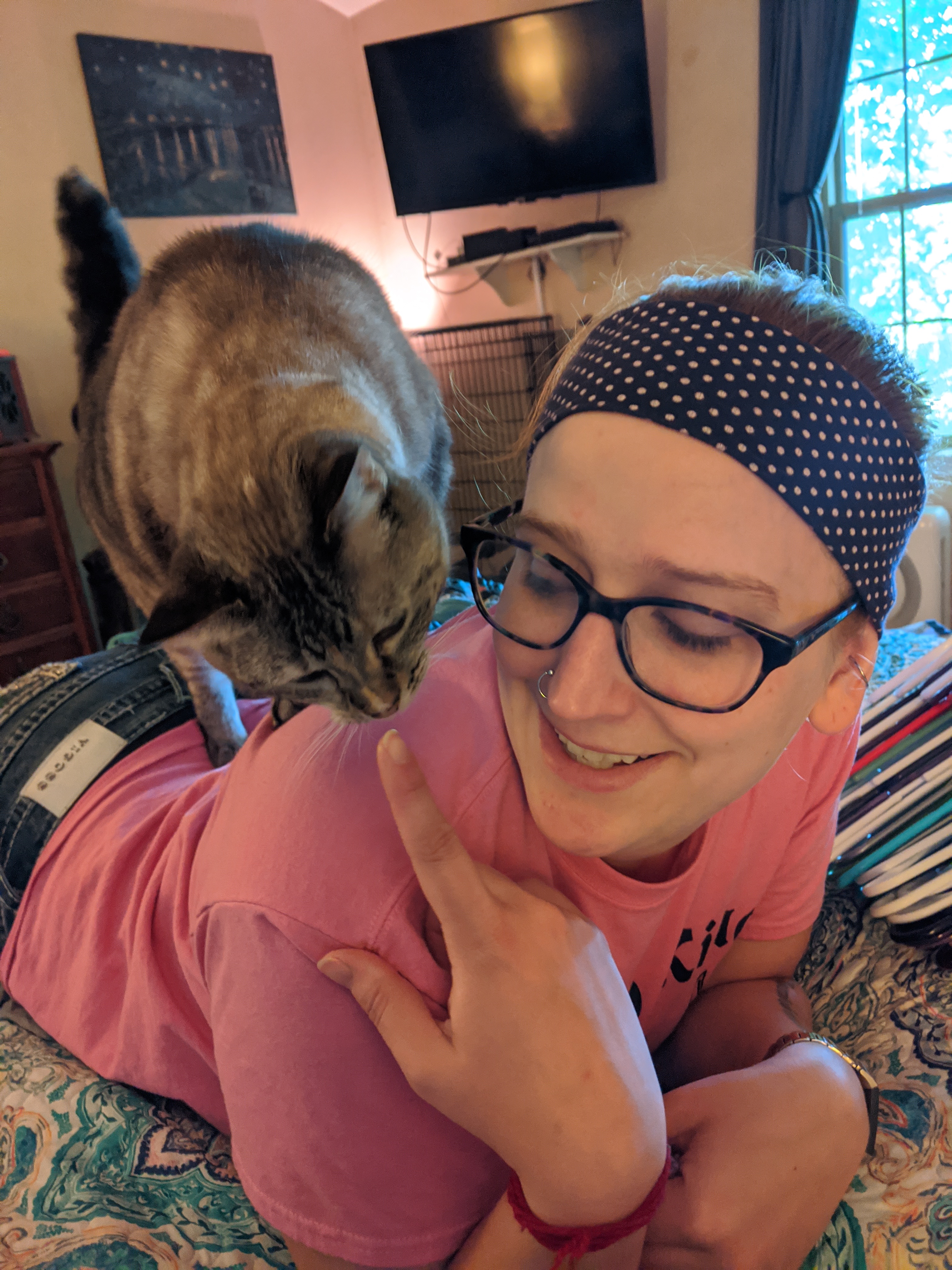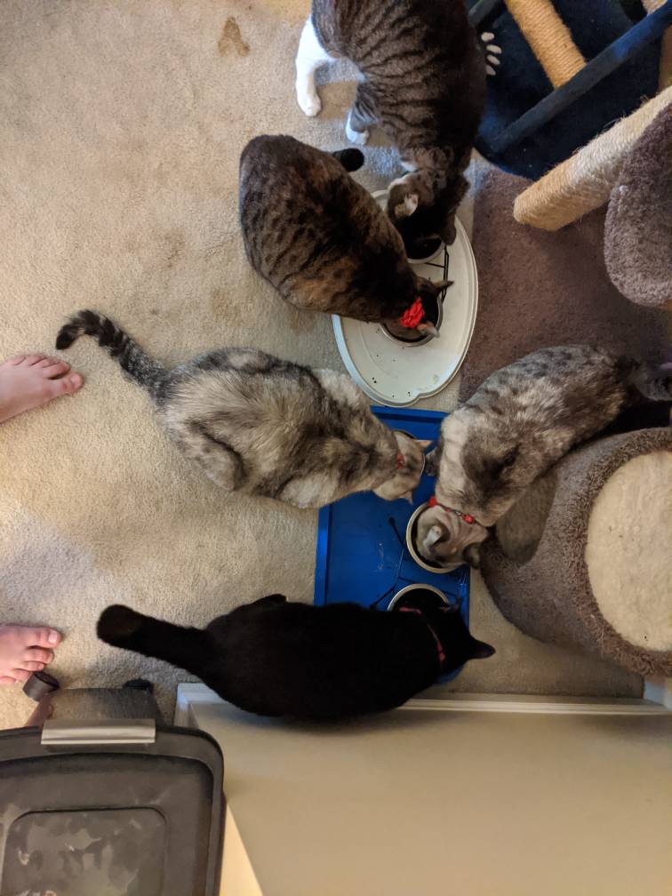 We have 2 dogs: Dexter (a Shih Tzu/Terrier mix), Freyja (a Great Dane). We have 5 cats: St Francis of Assisi (Franny), Martin Luther, Mary Magdalene (Maggie), St Hildegard of Bingen (Hilde), and Gomez. We also have 8 chickens.
