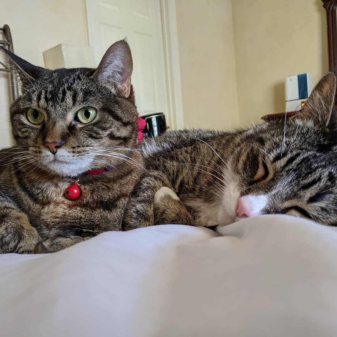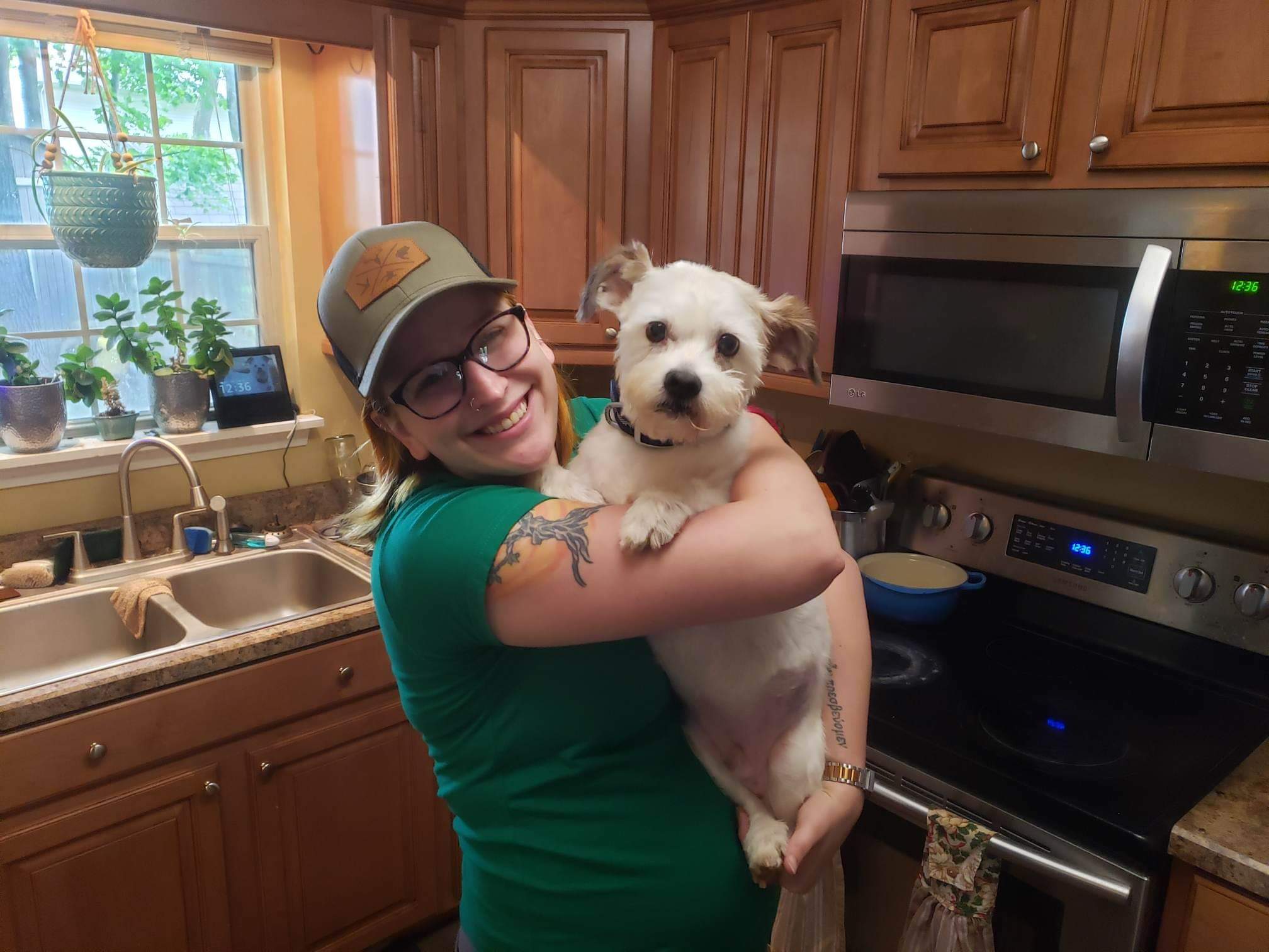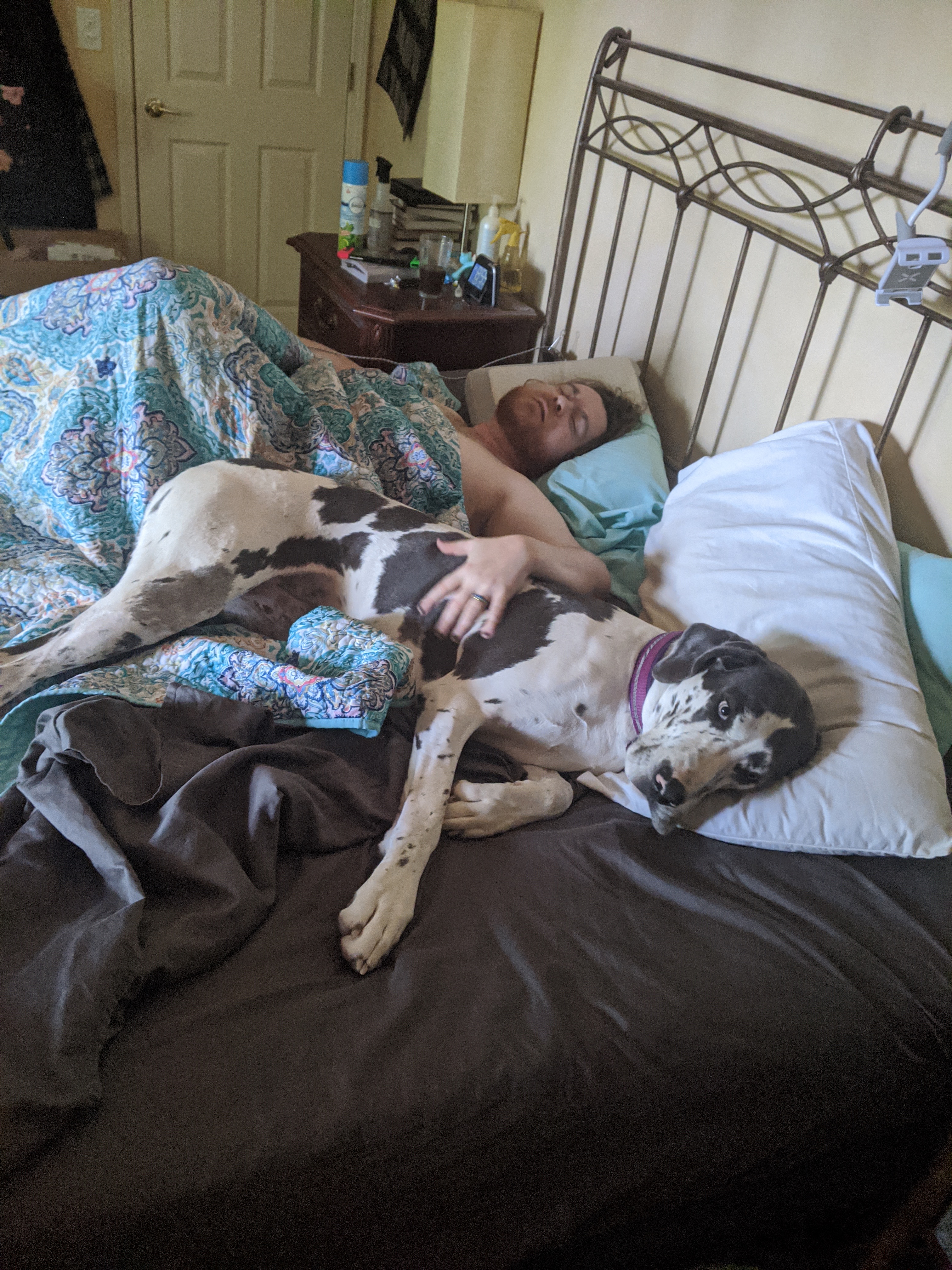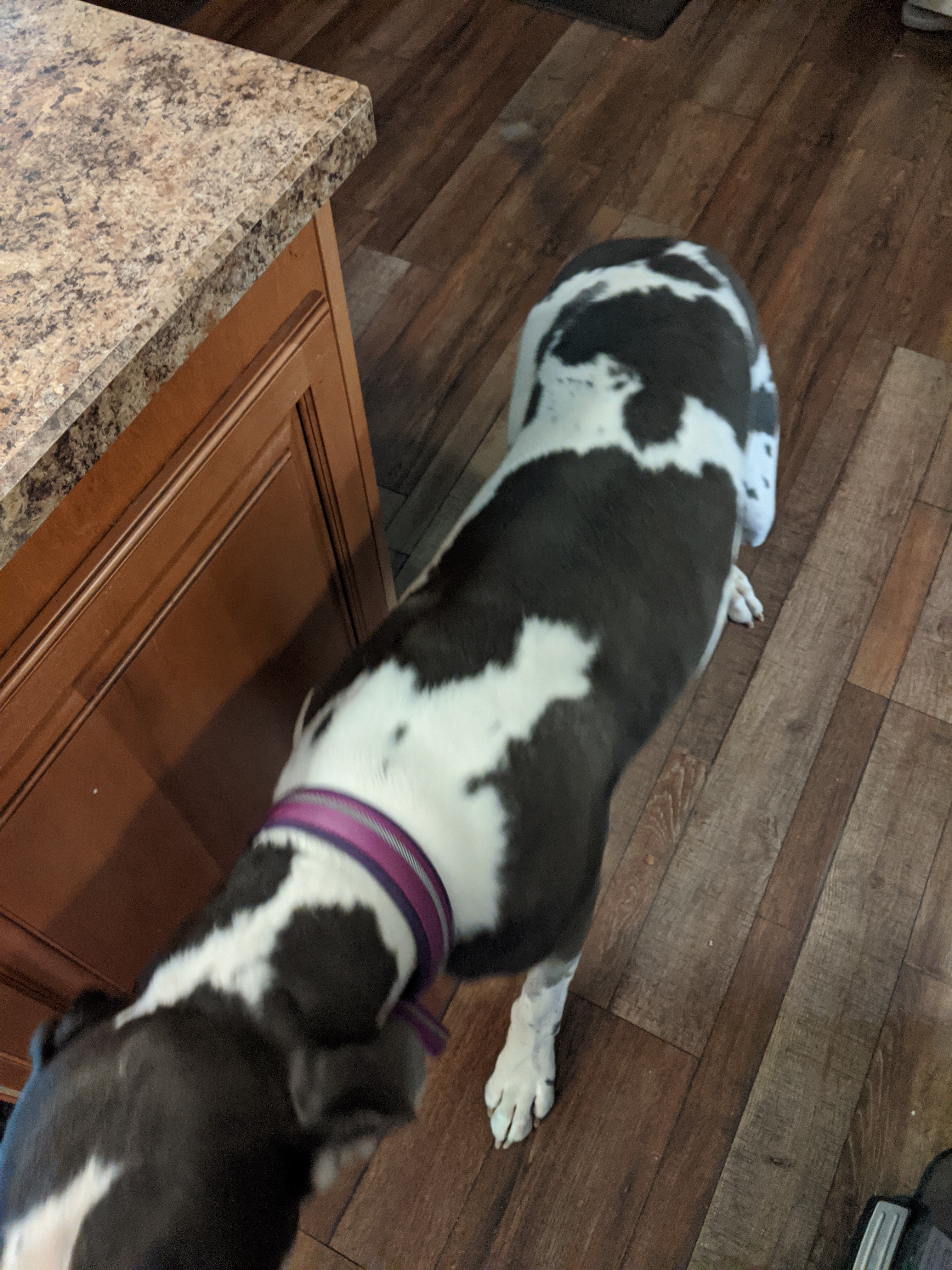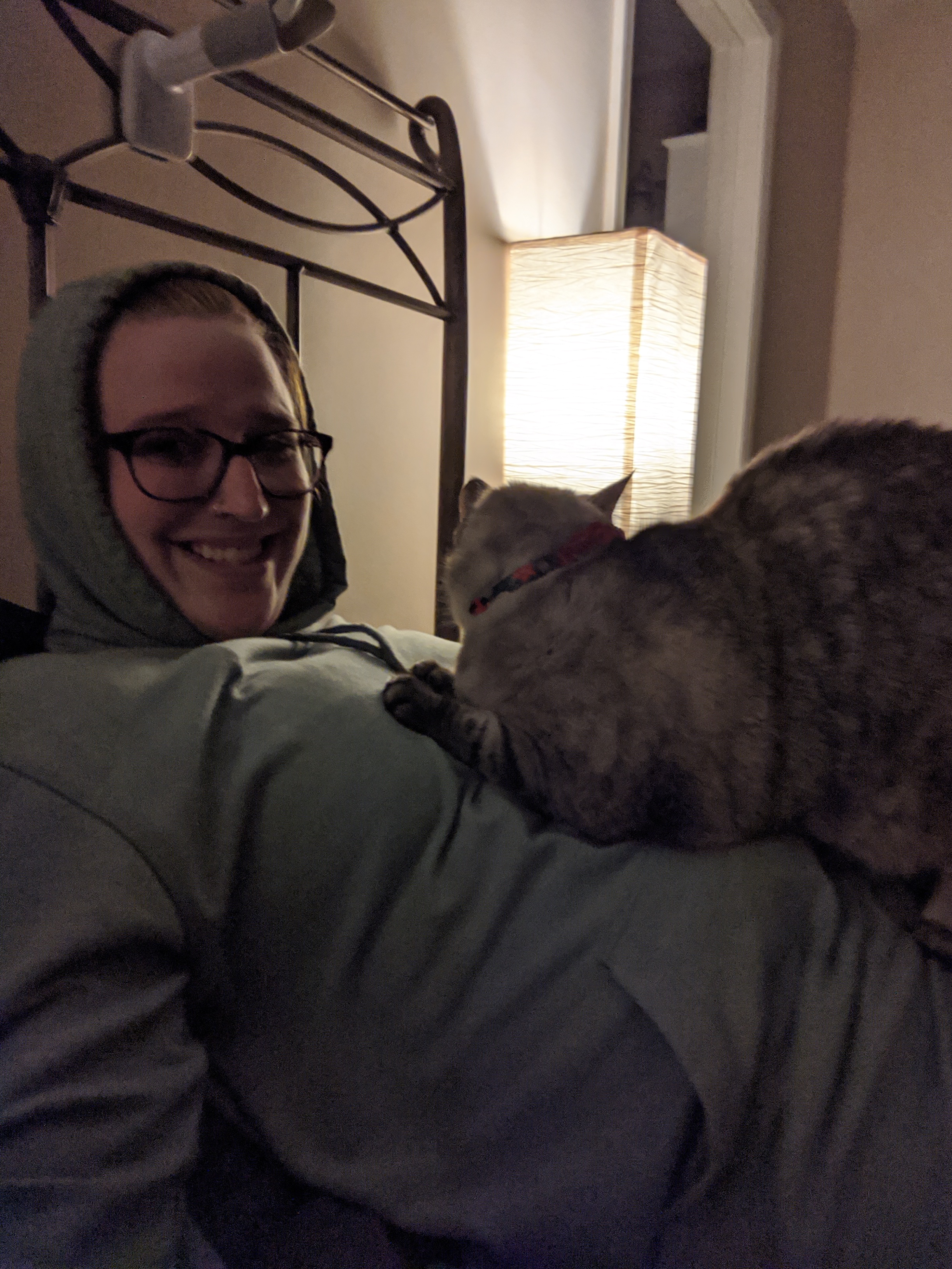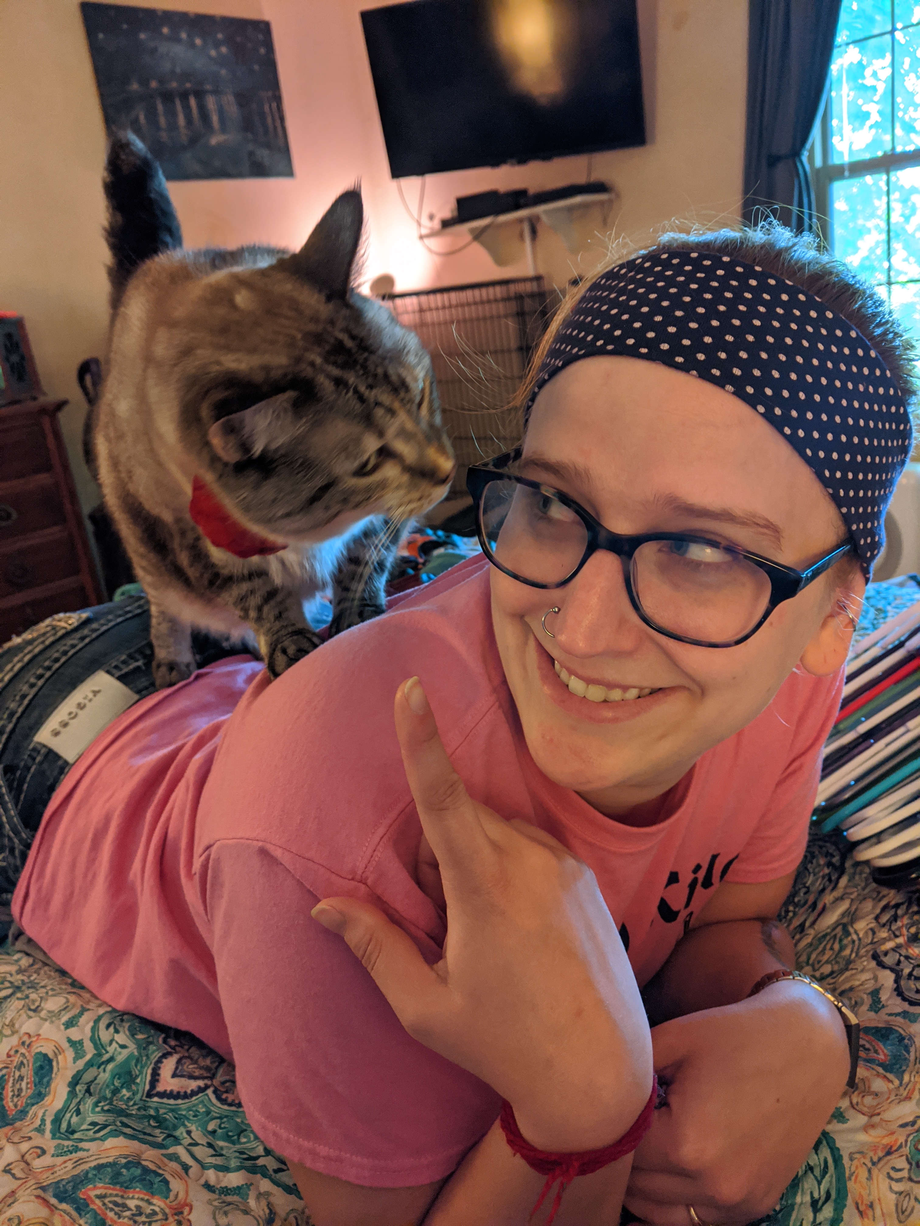 We have 2 dogs: Dexter (a Shih Tzu/Terrier mix), Freyja (a Great Dane). We have 5 cats: St Francis of Assisi (Franny), Martin Luther, Mary Magdalene (Maggie), St Hildegard of Bingen (Hilde), and Gomez. We also have 8 chickens.