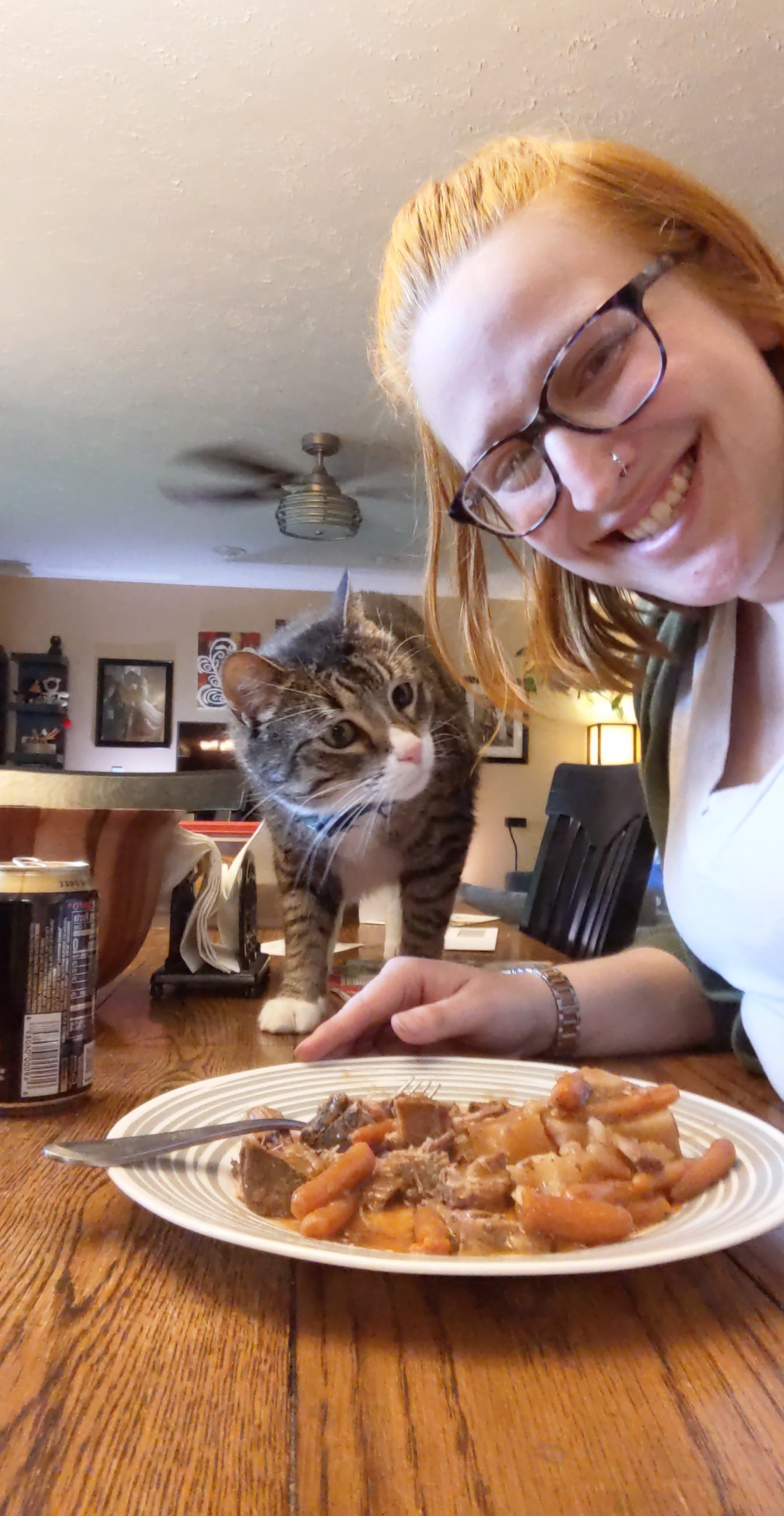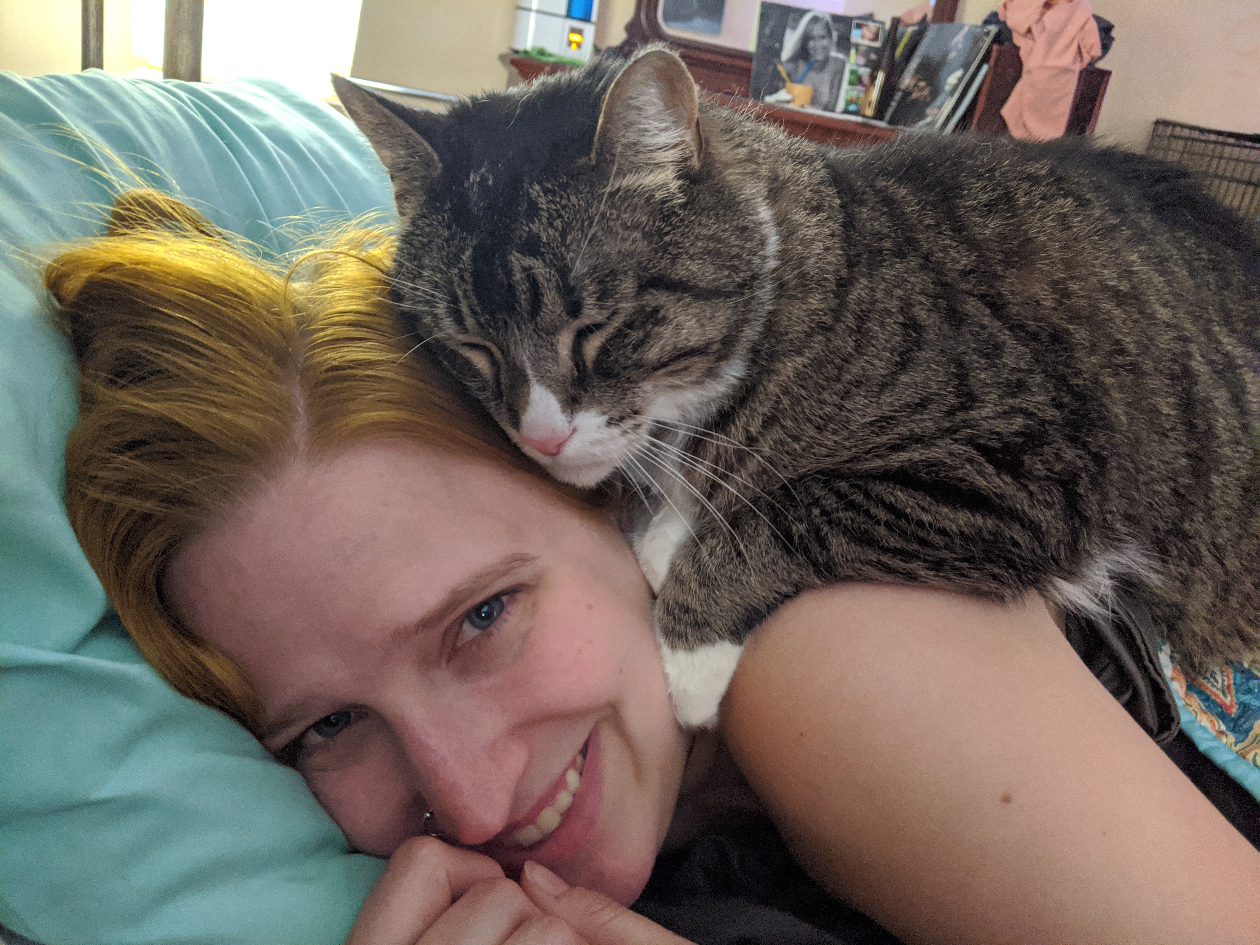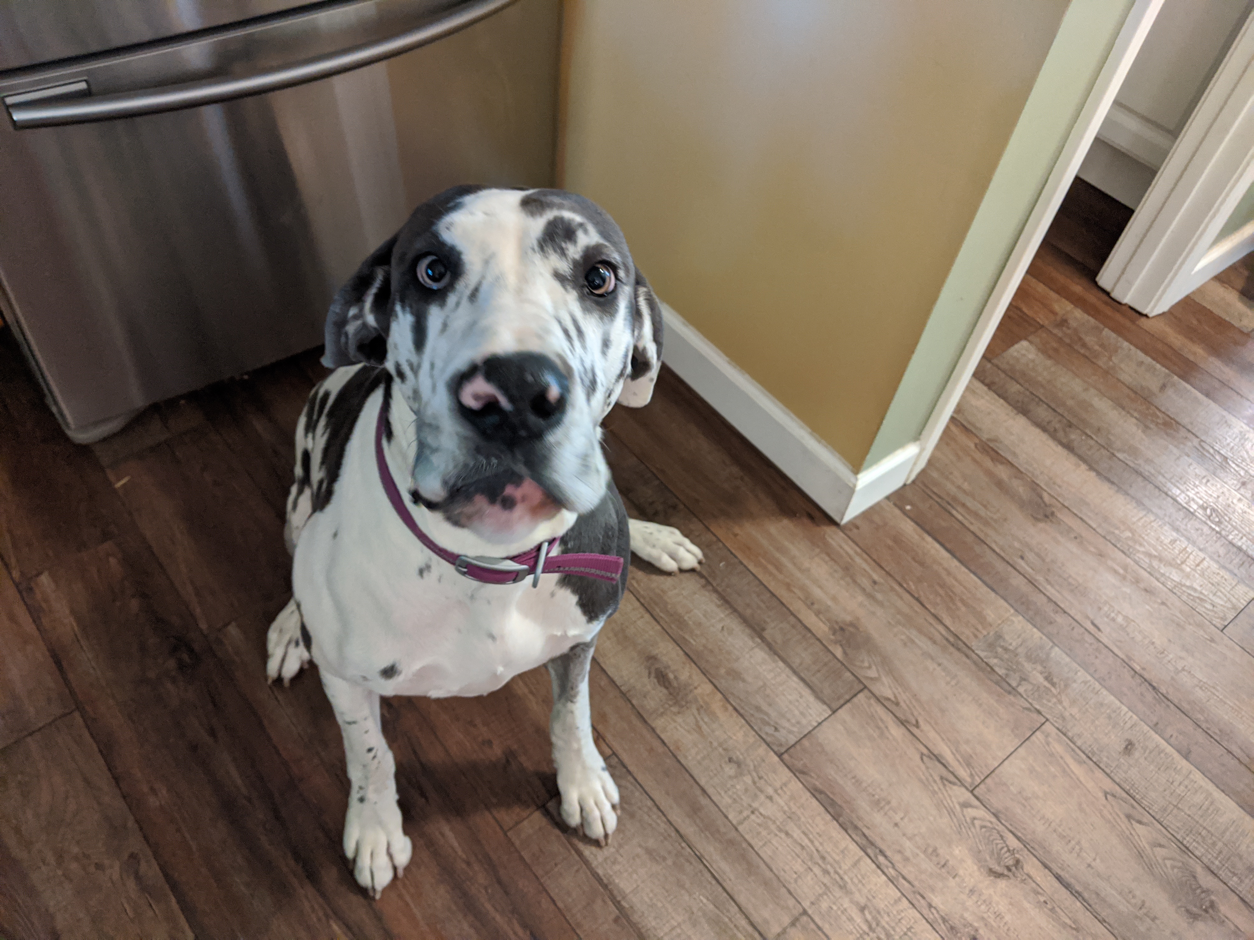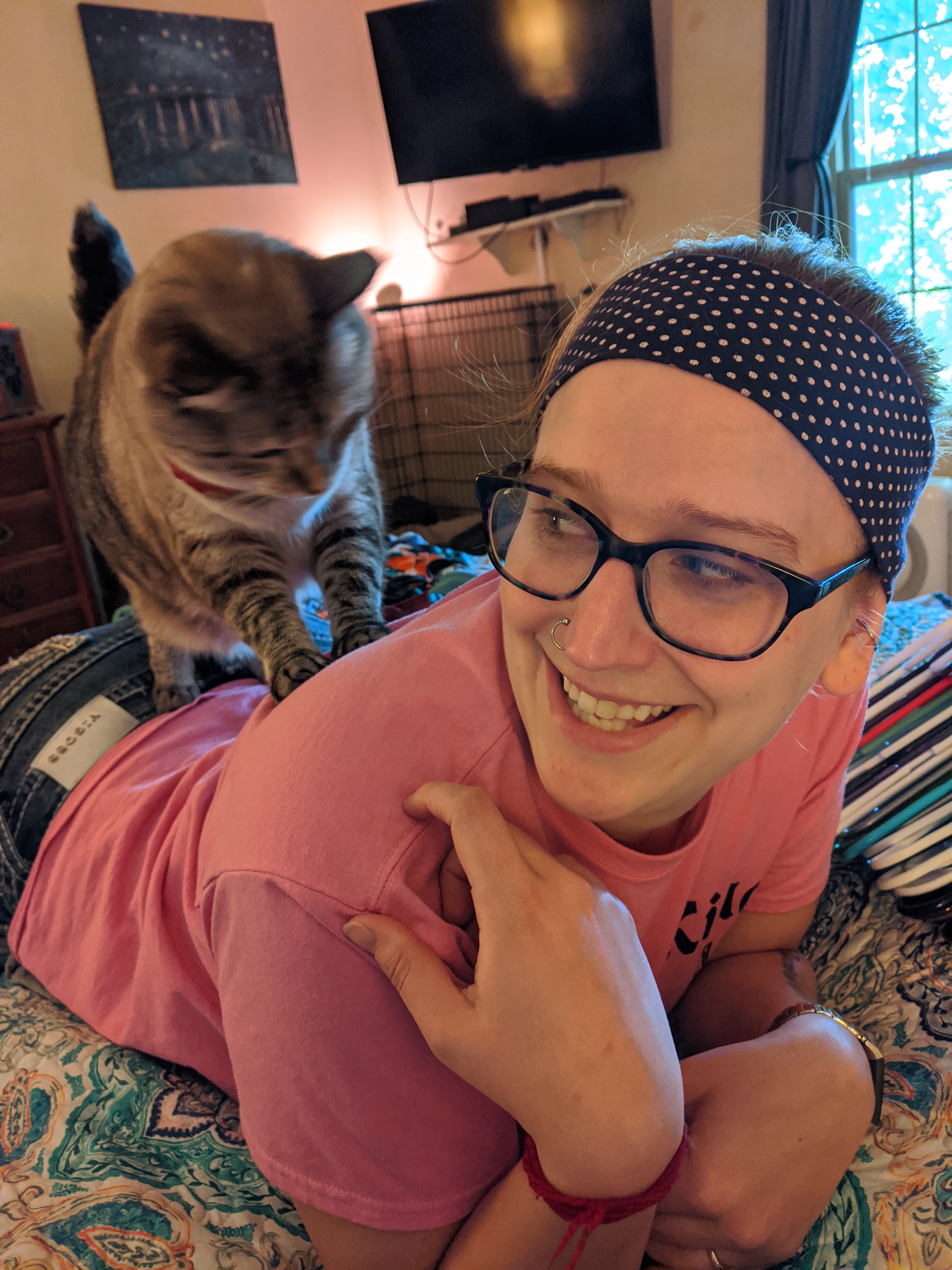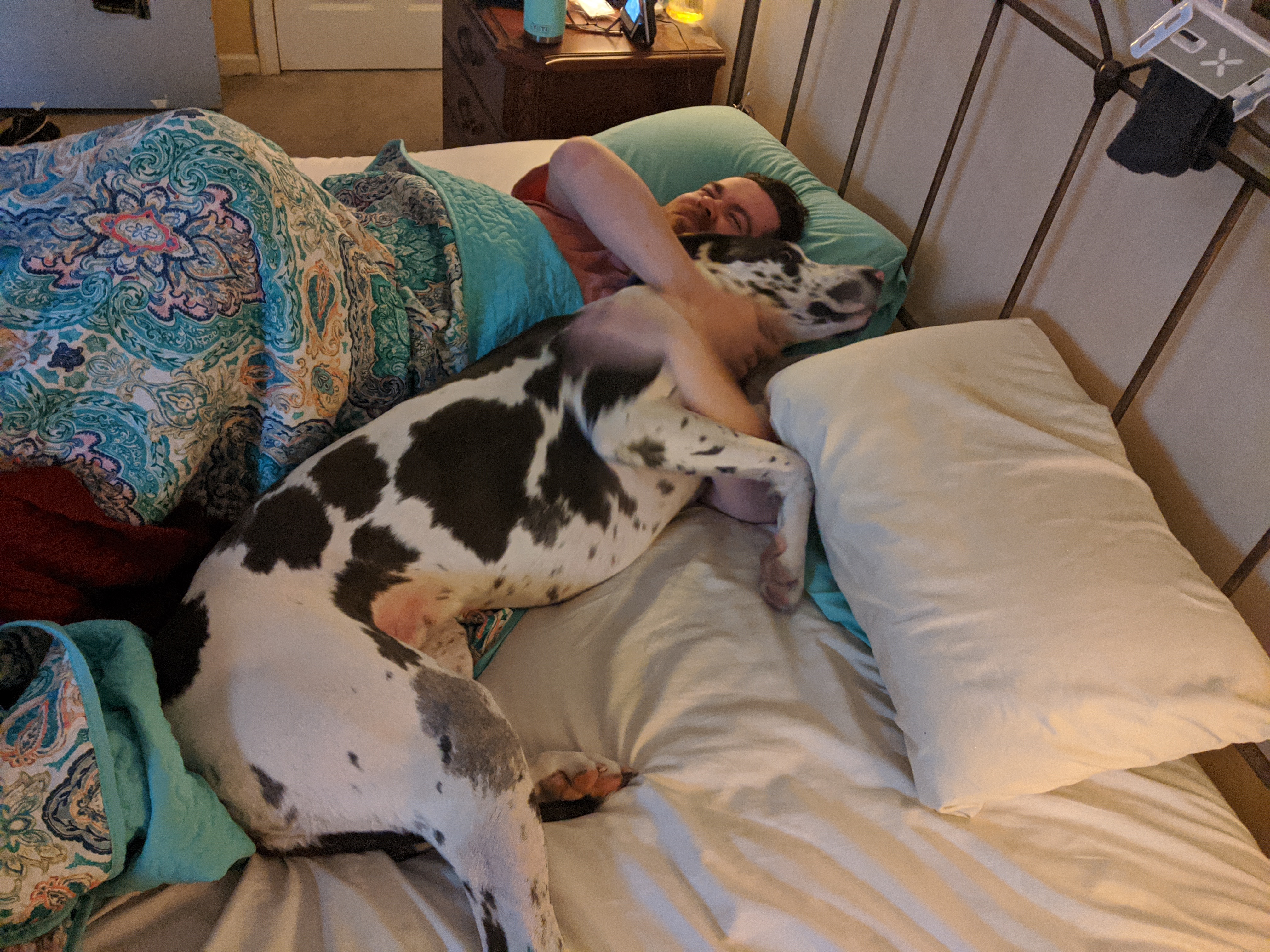 We have 2 dogs: Dexter (a Shih Tzu/Terrier mix), Freyja (a Great Dane). We have 5 cats: St Francis of Assisi (Franny), Martin Luther, Mary Magdalene (Maggie), St Hildegard of Bingen (Hilde), and Gomez. We also have 8 chickens.
