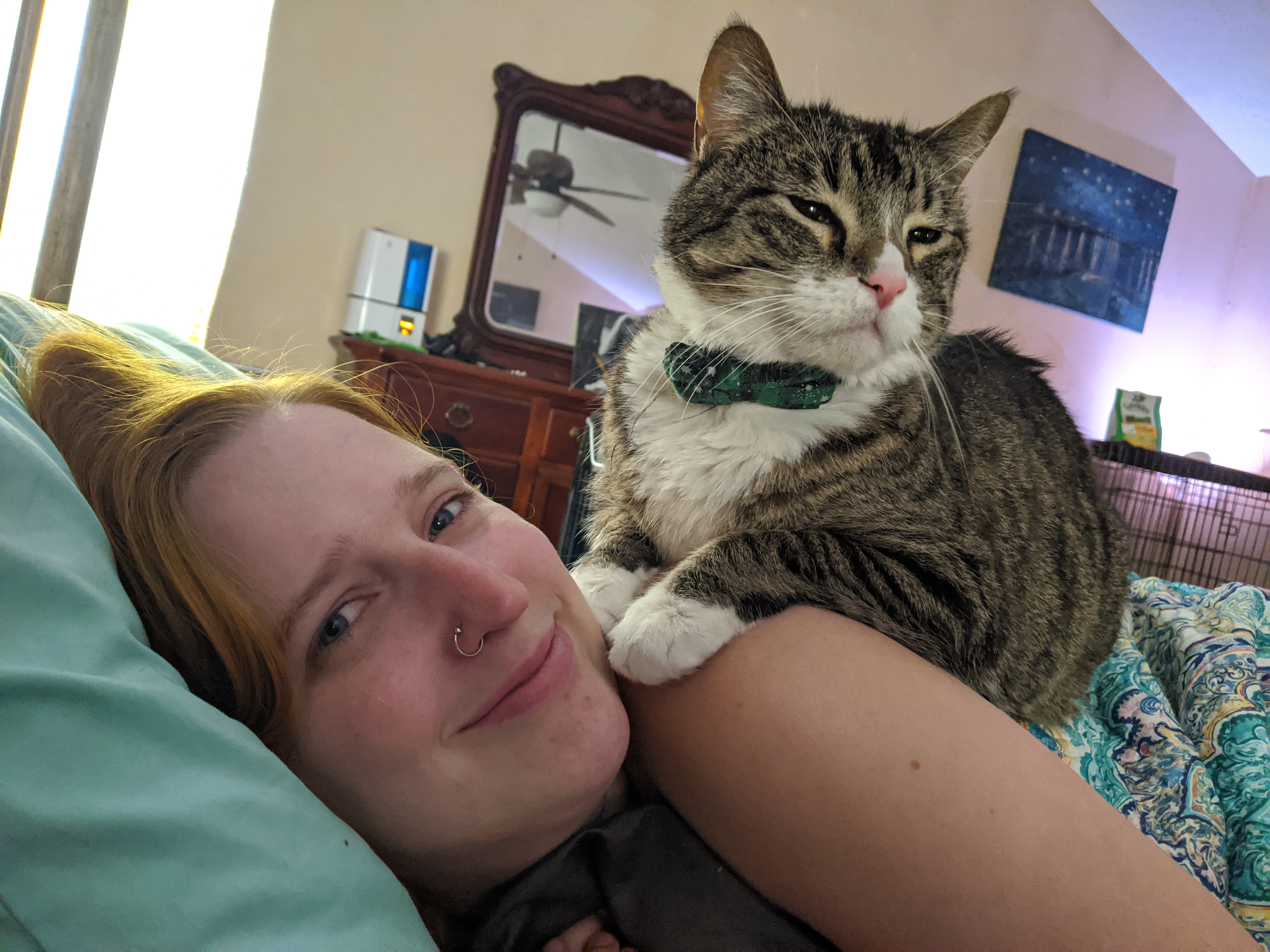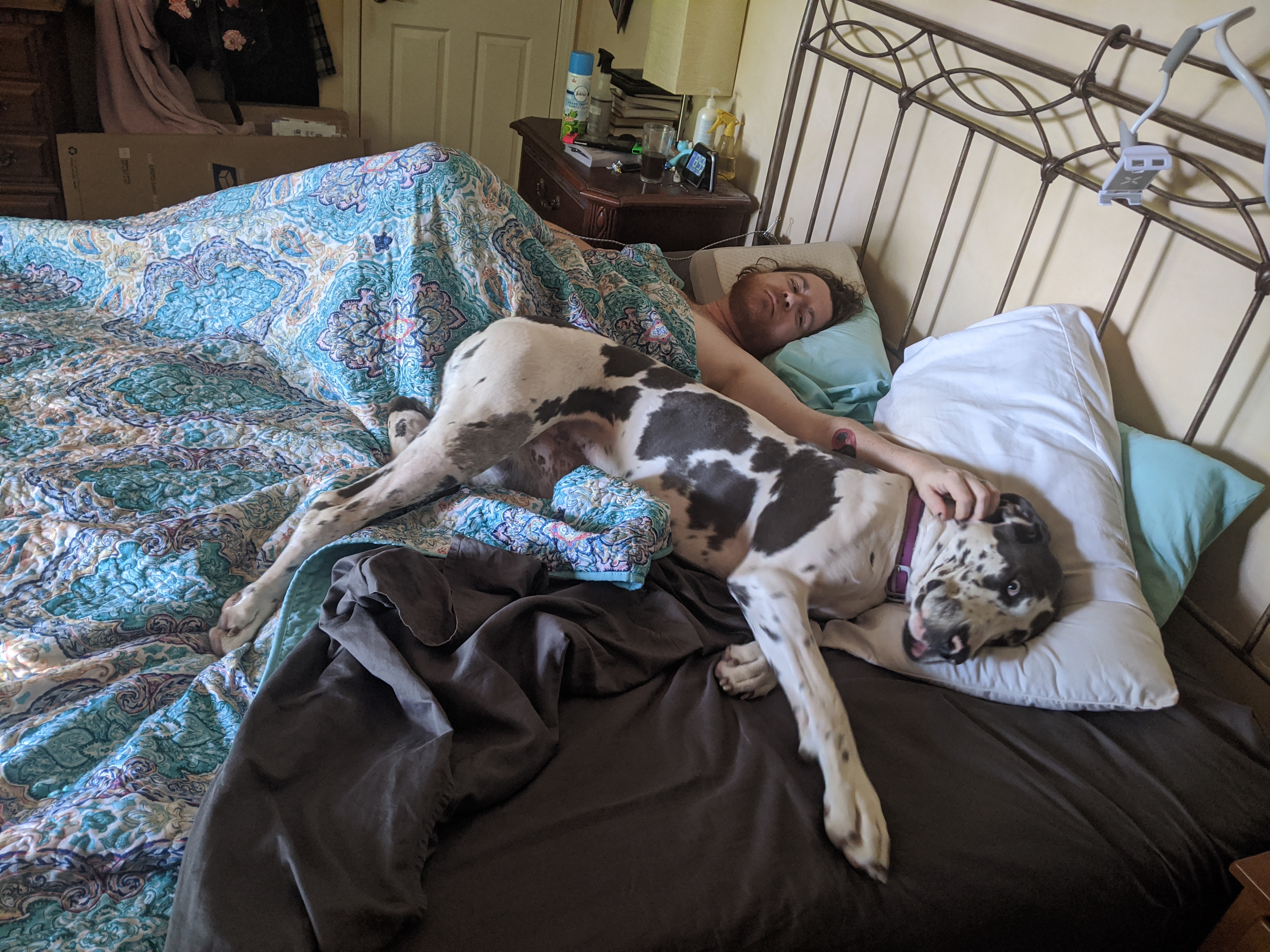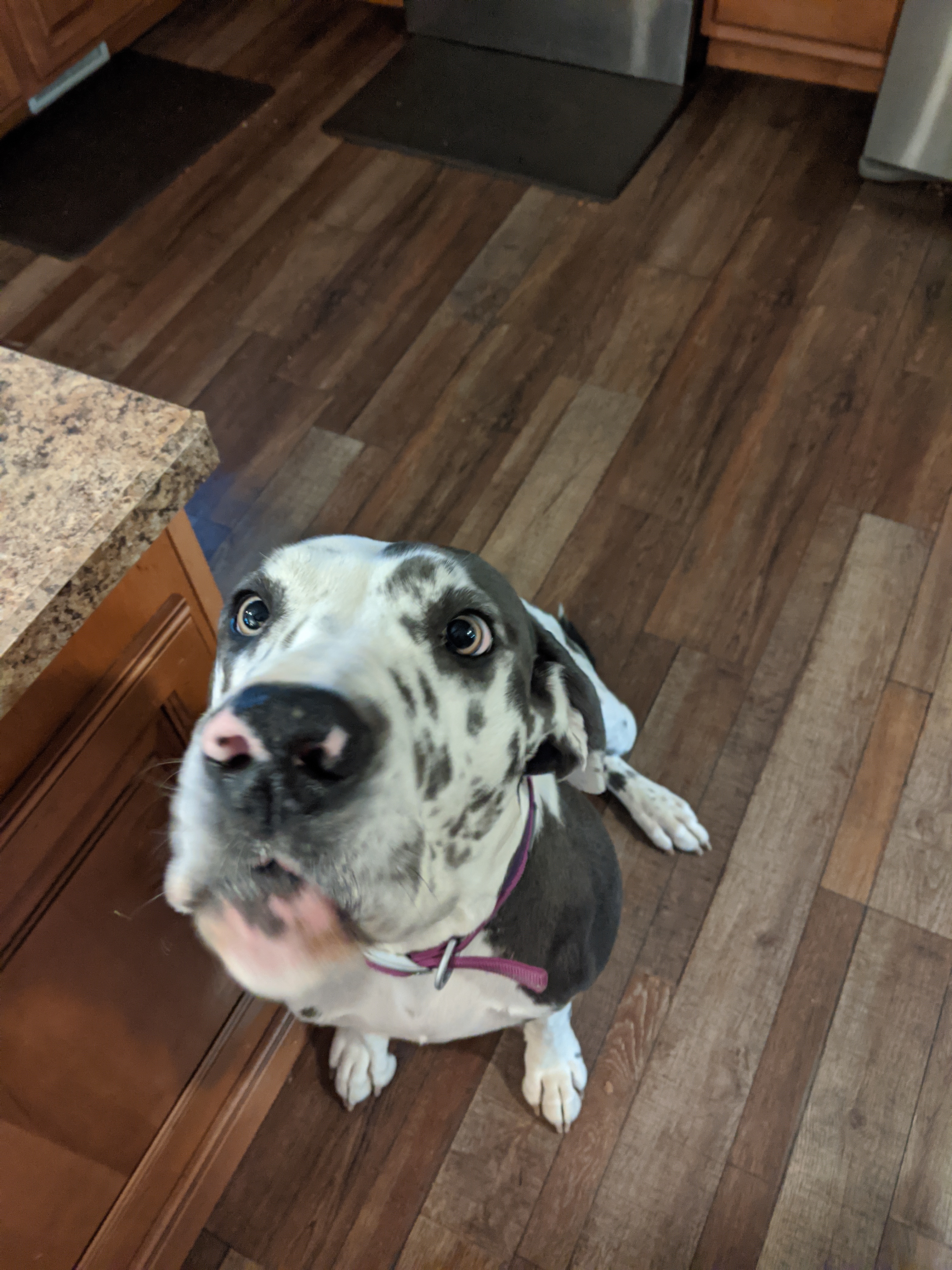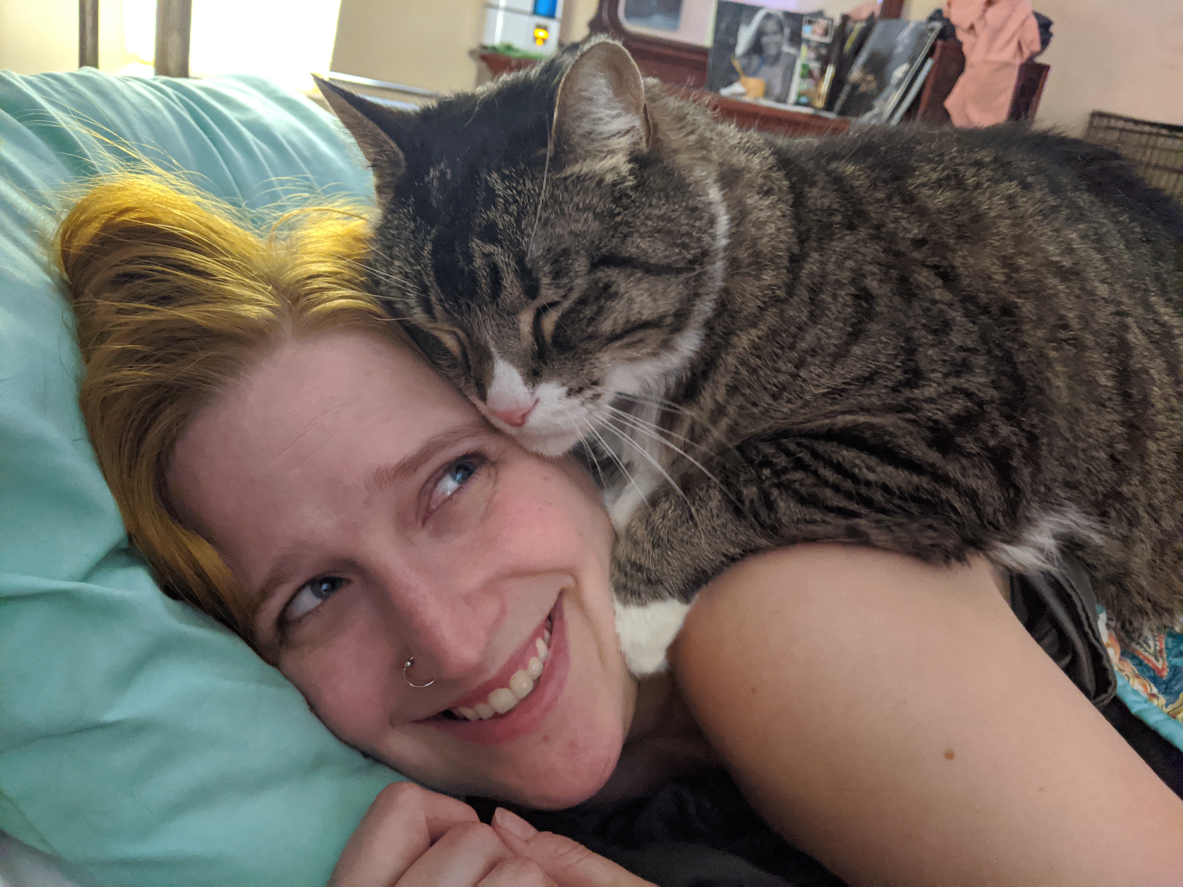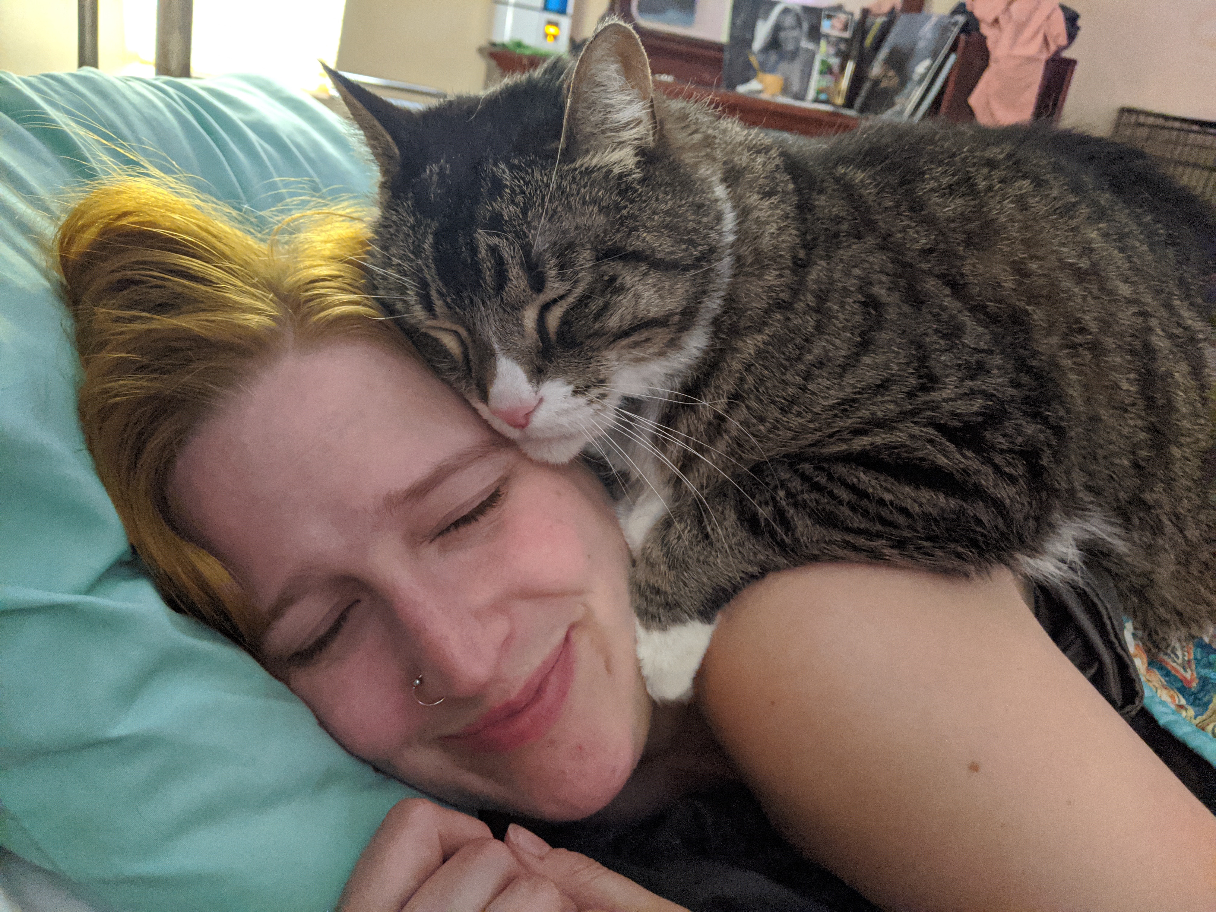 We have 2 dogs: Dexter (a Shih Tzu/Terrier mix), Freyja (a Great Dane). We have 5 cats: St Francis of Assisi (Franny), Martin Luther, Mary Magdalene (Maggie), St Hildegard of Bingen (Hilde), and Gomez. We also have 8 chickens.