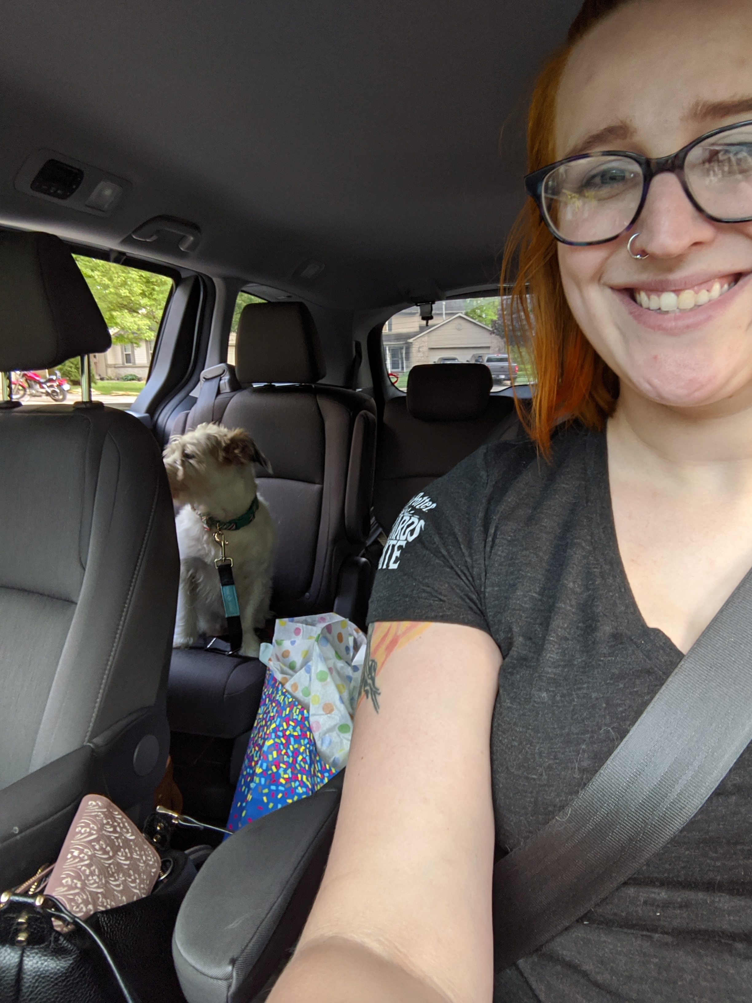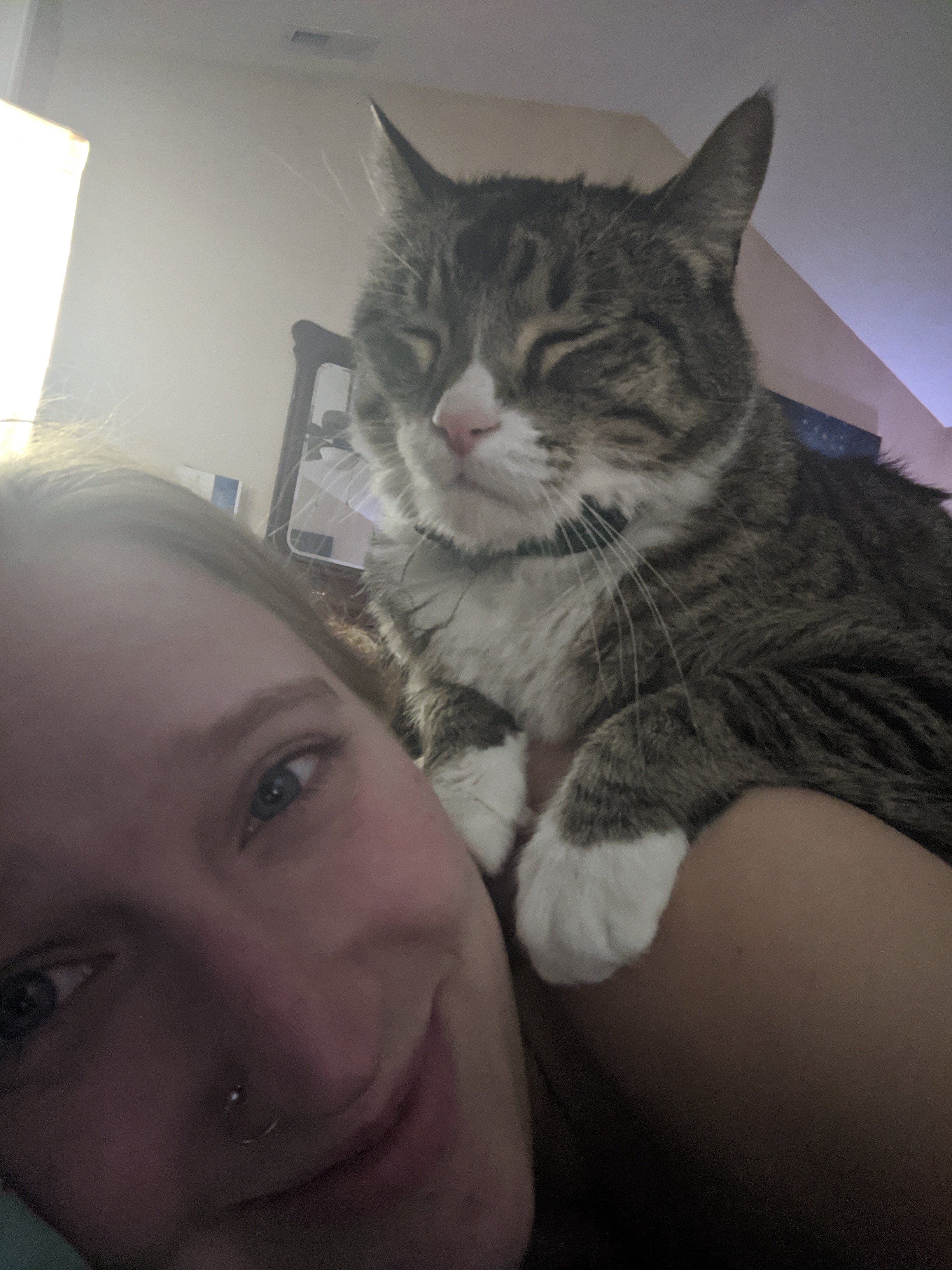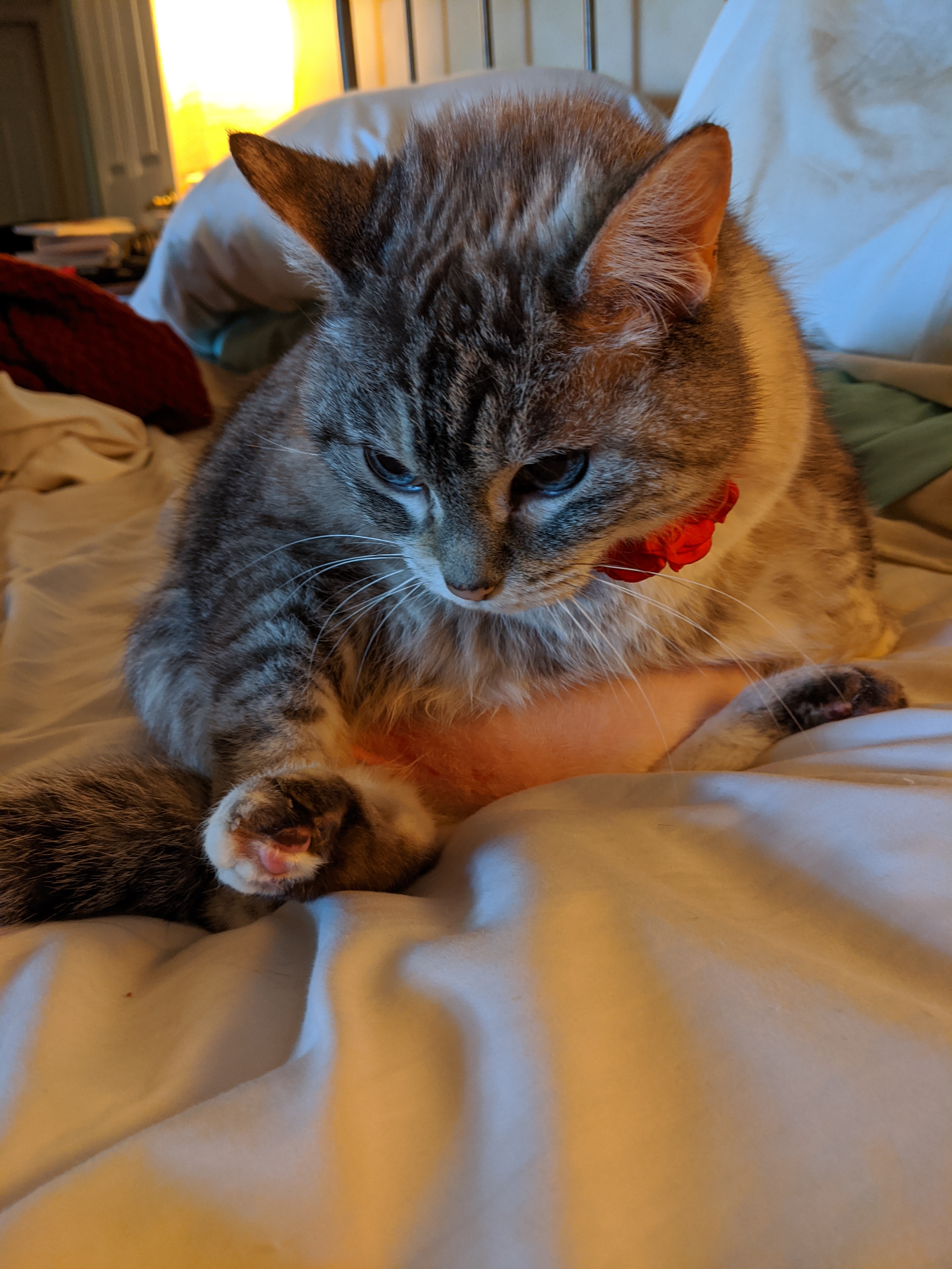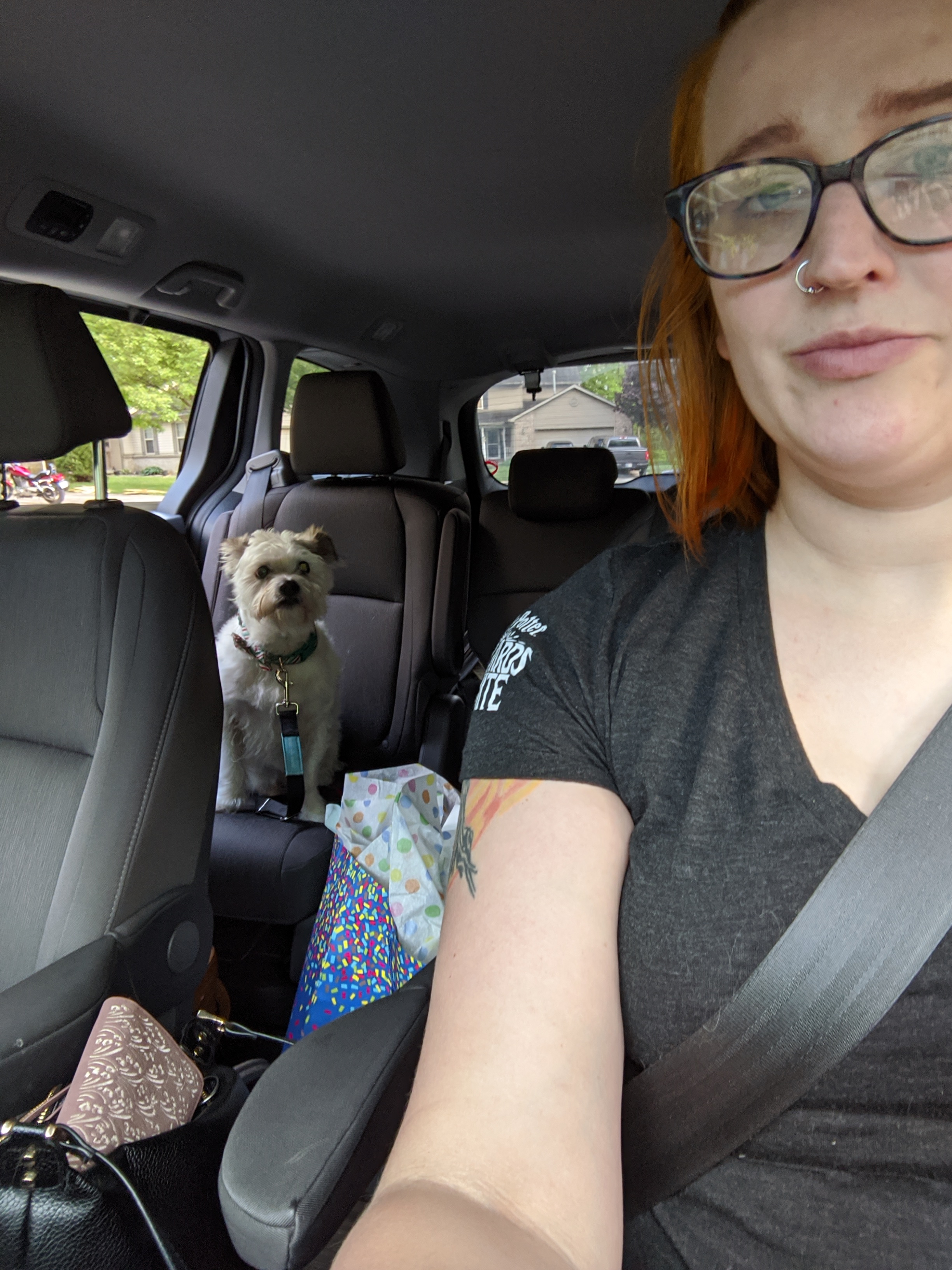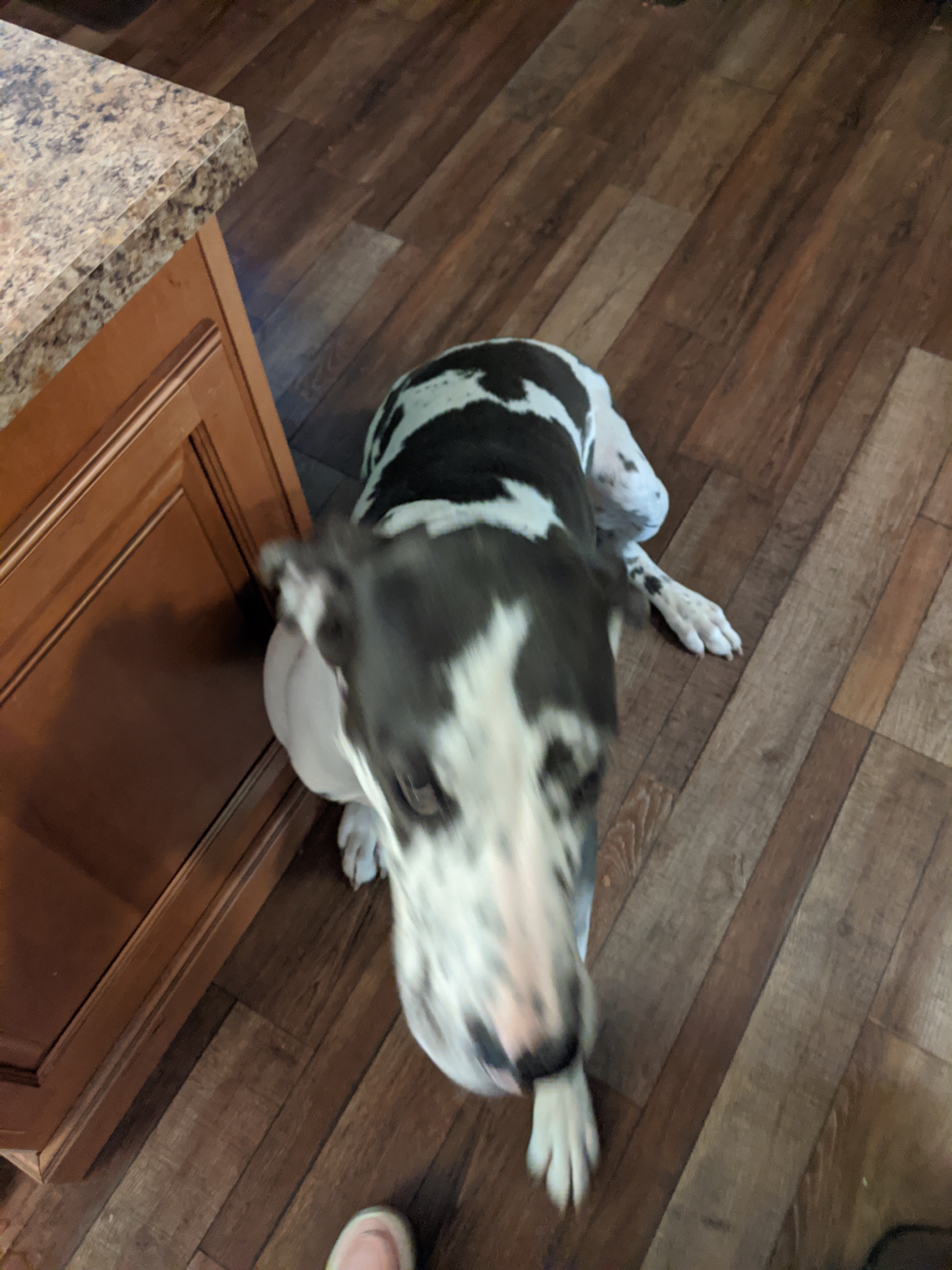 We have 2 dogs: Dexter (a Shih Tzu/Terrier mix), Freyja (a Great Dane). We have 5 cats: St Francis of Assisi (Franny), Martin Luther, Mary Magdalene (Maggie), St Hildegard of Bingen (Hilde), and Gomez. We also have 8 chickens.